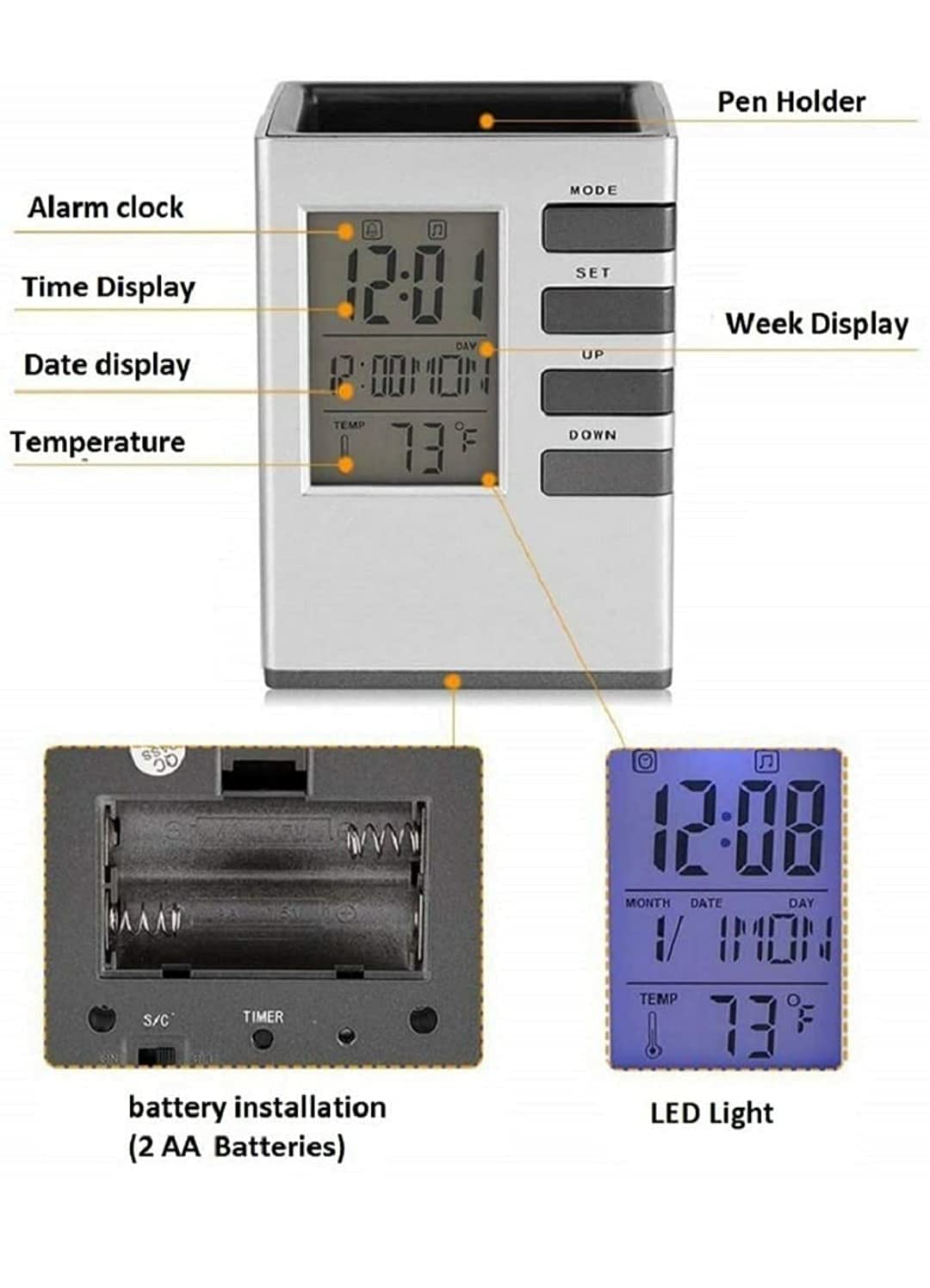 Add a modern touch to your workspace with thisĀ multi-functional pen holderĀ that does more than just organize your stationery. Featuring an integratedĀ LCD digital clock, calendar, and alarm, this stylish desktop essential combines practicality with a professional finishāperfect for both home and office use.